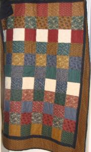 After my daughter helped me to lay out the fabric strips a simple quilt top of squares was quickly completed, so it was back to the shops to get woollen wadding, a complementary fabric border and backing. And with a concentrated effort over the next few days a quilt quickly emerged from the raw materials.