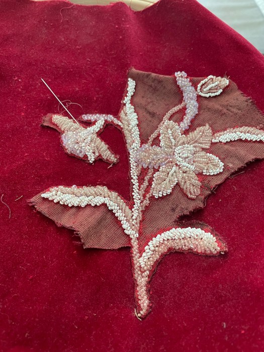 - Some years later I am still working on this project. After finding some lovely red velvet and backing this with a heavy stabiliser to give me something to hold in the hoop, stitching started. I can only do a little at a time, as passing the fine needle, thread with a fine nylon, through the tiny beads, which already have a thick thread holding them together, is tricky. But little by little I will work on getting to a stage where it can be framed so that Lily May’s beadwork can be enjoyed by another generation, or more.